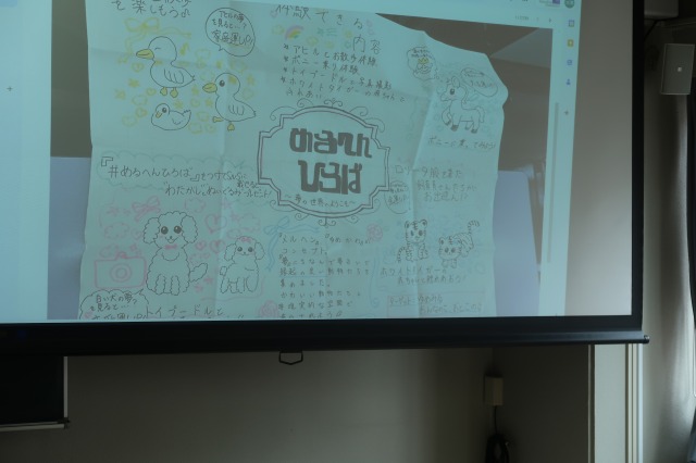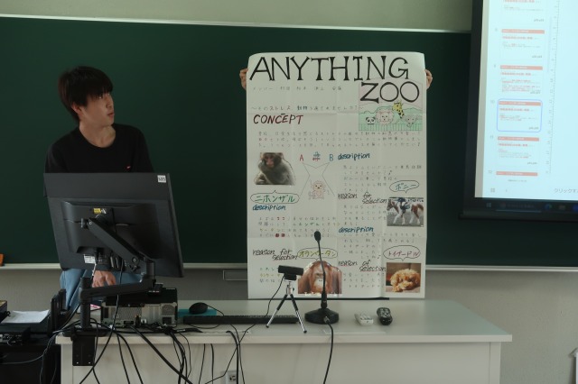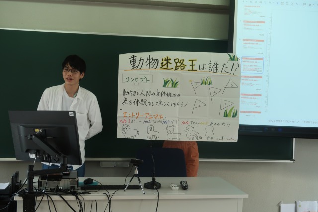2週目の授業内では各グループが順番にプレゼンテーションを行いました。多くのグループが、ターゲットや狙いを絞りコンセプトに沿った企画を設定することに成功しているように感じました。また、「非現実的で他にはないイベント」にするよう意識させたこともあり、ユニークな発想から選んだ動物たちの特性や良さを生かした企画に仕上がっていたのが印象的でした。その一方で、今回初めて本格的なプレゼンテーションを行ったため、学生たちには、企画立案や授業時間外のスケジュール管理などの課題も残りました。