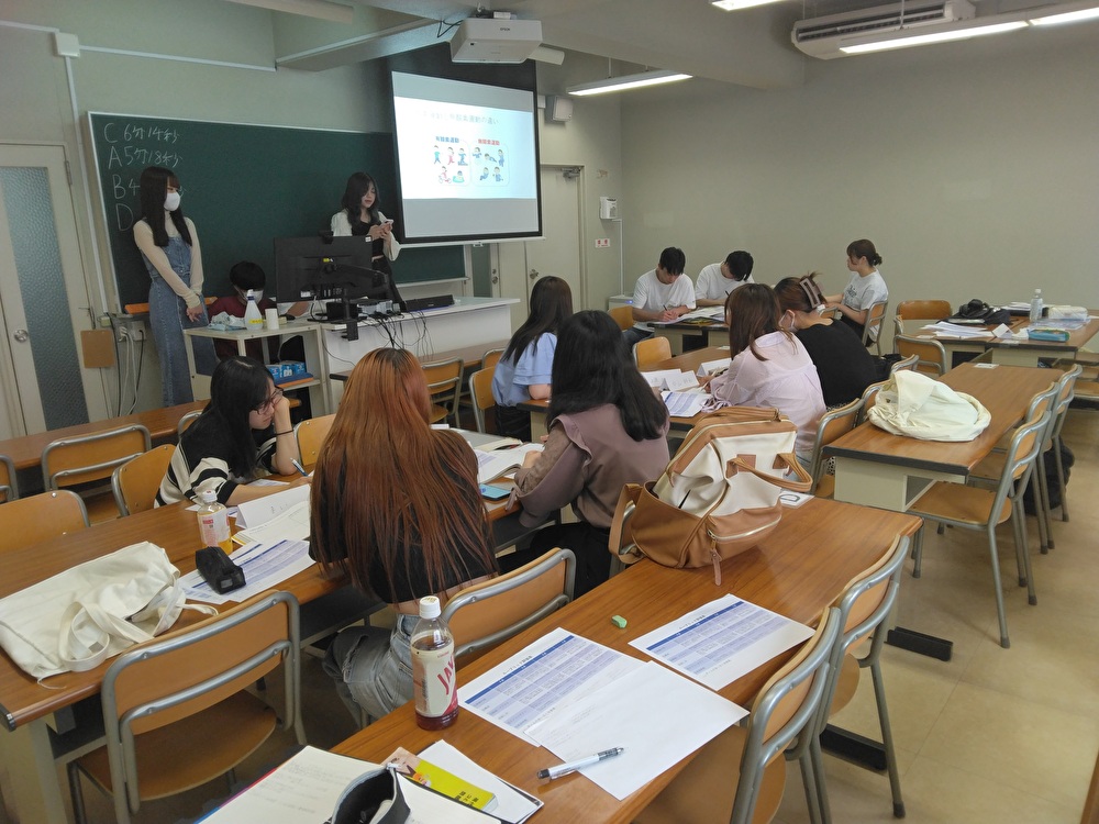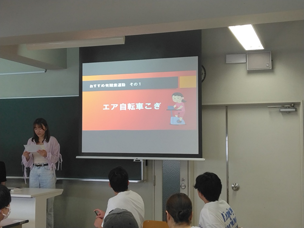 3週目は、発表を行いました。どのグループもとても聞きやすく、前回の授業で解説した内容をしっかりと取り入れた発表でした。学生達が紹介してくれたおすすめのダイエット方法を活用して、私もこの夏はダイエットに励もうと思います。