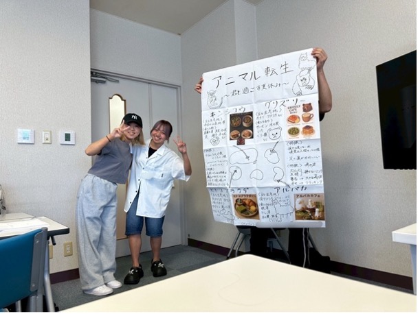 チームごとに企画会議をして、模造紙にまとめて発表するワークを、2週にわたって取り組みました。内容は、文化祭で「移動動物園」を実施するにあたって、12種類の動物の中から4種類を選び、「他にない動物園を企画しよう!」というテーマで、どんな企画にするかを考えるというものです。いよいよ、イベントプロデュース学科の実力が試されます!